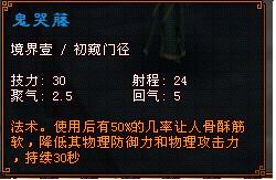 20级技能鬼哭藤:这个技能本人和少用,只有再刚学的时候用过几次,境界1成功率是50%,但是由于出招 时间过长,一直没怎么用,估计后期打BOSS很好用