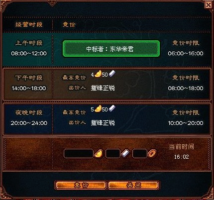 每个驿站每天分三段时间经营:分别是早上8点到中午12点下午2点到傍晚6点晚上8点到半夜12点。你可以分段竟价,也可以把三段时间全包了。早上6点到中午这段时间是人数在线最少的时间,所以坐驿站的人相对少一些,所以没多少人竞争,投的本钱也相对少一些。下午2点傍晚6点这段时间在线的人数比较多,相应的竞争也更激烈,但是收入也不菲。晚上8点到半夜12点这段时间是黄金时间,在线的人数最多,必争的时间段。