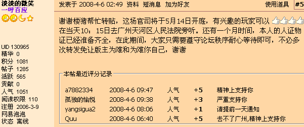 (淡淡的微笑代表众天下贰玩家与WY官司的说明)5月14日广州开庭