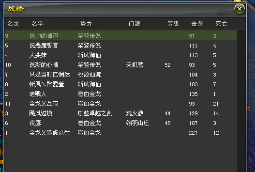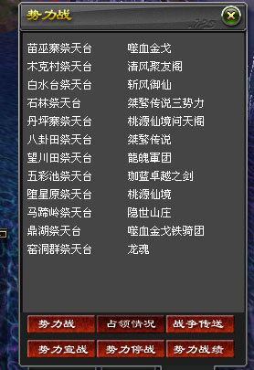这场势力战,老“忆江南”的 嗜血金戈 和 桃园仙境 各占领2个据点。9L争夺最激烈,老YJN的“生死盟”一度夺得“木克村”据点,最后还是失手,老YJN的“义轩”一度夺得“白水台”,也同样最后失手。