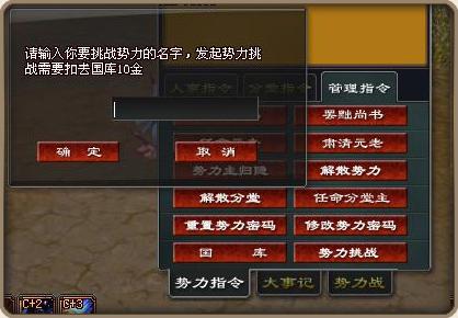 在势力挑战的时候,各大势力的势力主都有权利来寻找自己的对战目标。当势力主打开势力栏后,在管理指令分栏中可以寻找到“势力挑战”这项。在点击之后,系统会给出一个对话框,在空白处填入所要挑战的对象,就可以完成势力挑战的系统声明了。一般在系统显示挑战宣言后的30秒,两个势力的敌对关系就正式建立起来了。