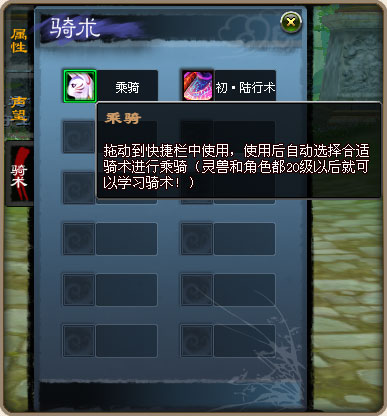 完成初级骑术任务以后,就会自动获得初级骑术。这时您用鼠标打开人物属性界面中骑术栏,然后右键点击其中的灵兽头像,在经过一段吟唱时间之后,您就可以乘骑灵兽肆意闯天下了。
