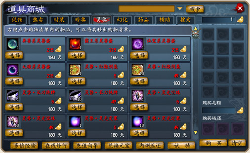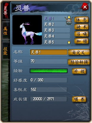 除此之外,灵兽的“喜悦点”和“好感度”也是灵兽成长的重要辅助参数。“喜悦点”为正的时候,每喂给灵兽一件装备或者炼化石,它将获得双倍的成长值;灵兽的“好感度”大于一定数值之后,灵兽自身的属性才能附加在人物角色的身上。灵兽的“喜悦点”可以通过道具“灵兽•灵光果子”补充,而“好感度”则可以通过在灵兽商人处购买各种灵兽饲料来提升。