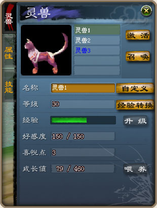 好感度:是灵兽对主人的好感程度,决定了灵兽基本属性加成到主人身上的百分比以及灵兽的乘骑速度。通过喂食灵兽饲料来提升好感度。这些饲料在九黎城门口有出售,稀有的喂养饲料会在道具商店里面出现。