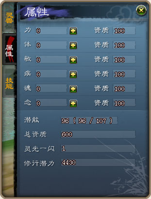 3、灵兽的修为潜力,同灵兽可分配潜能点和总资质相关,点数和资质越高,则修为潜力越高;