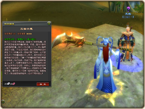这一系统的特色任务以难度较低,流程便利,奖励丰富著称,一直都是天下玩家每周必做的任务之一。30级以上的玩家可以在九黎石林地区或者九黎孔雀坪地区完成三仙六魔任务。