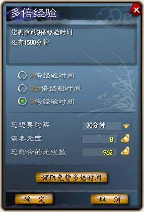 多倍经验状态分为2倍经验时间、2.5倍经验时间、3倍经验时间三种,您可以在界面中选择需要购买的经验倍数,右边的对话框中会显示可以购买的累计时间,在下线时系统会对您累计的时间余额进行更新,时间余额设有上限,累计达到上限后将不再增加。