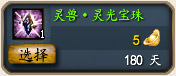 灵兽•灵光宝珠:当前激活灵兽等级在51-70级时可以使用。使用后,可以使当前激活的灵兽增加66点喜悦点。(如果喜悦点为正值,则每喂食1件装备增加灵兽成长值的同时,扣除1点喜悦点,成长值加倍。)